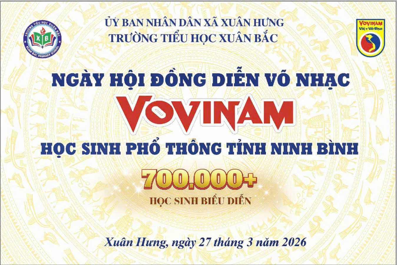 Thực hiện công văn số 520/SGDĐT-CTHSSV ngày 03/3/2026 của Sở Giáo dục và Đào tạo tỉnh Ninh Bình về việc tổ chức triển khai Chương trình đồng diễn Ngày hội võ nhạc Vovinam và bài thể dục giữa giờ dành cho học sinh. Sáng ngày 27 tháng 3 năm 2026, trường Tiểu học Xuân Bắc đã tích cực triển khai và tổ chức hoạt động với sự tham gia đông đủ của cán bộ, giáo viên và học sinh toàn trường.